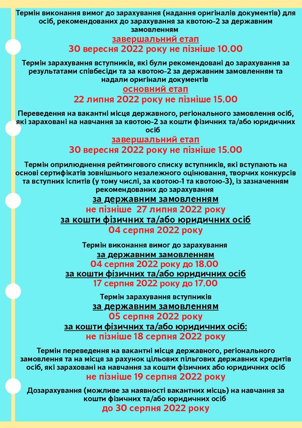 Етапи вступної кампанії Бакалавр 1 курс на основі повної загальної середньої освіти